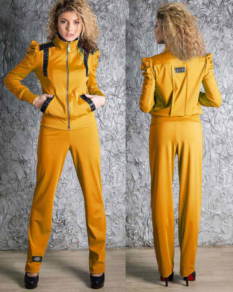 Костюм "Амазонка" изготовлен из стрейч-трикотажа "микродайвинг". Модель сочетает в себе гламурную роскошь и повседневную практичность, классику и кокетство. Брюки отличаются универсальностью, так как могут носиться как на талии, так и на бедрах, благодаря широкому эластичному поясу. Длина кофты 65 см, длина рукава 65 см, длина брюк 110 см Отделка: Металлическая фурнитура под золото, тесненные вставки "кожа"