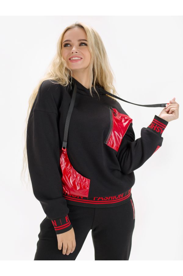Свитшот свободного кроя с капюшоном, который регулируется лентами. Спущенная пройма. Нагрудный карман с молнией, оформлен вставками из плащевки красного цвета. Низ свитшота и манжеты рукавов - довяз с надписями.