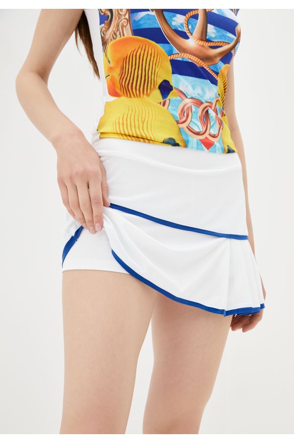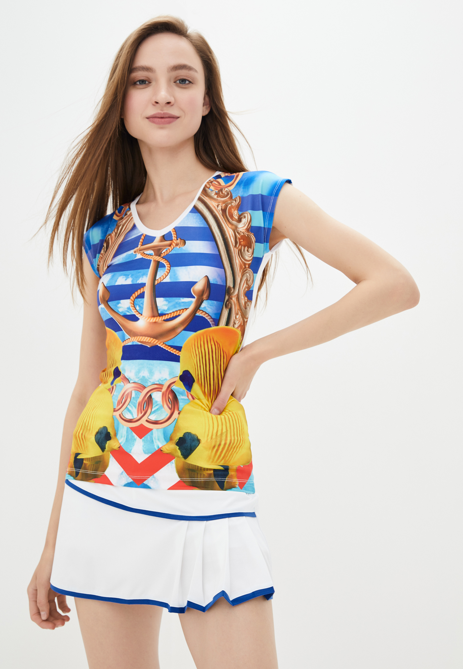 Оригинальный и невероятно стильный летний костюм "Дэвис" состоит из футболки и юбки-шорт. Модель создана в морском стиле из качественного материала, который имеет приятную текстуру. Юбка-шорты придает обладательнице этого костюма кокетливый и соблазнительный вид.
