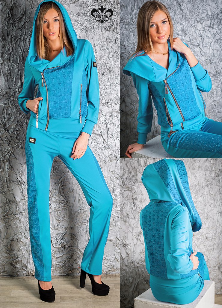 Костюм "Катрин" изготовлен из стрейч-трикотажа "микродайвинг"+ микродайвинг 3D, и сочетает в себе гламурную роскошь и повседневную практичность, классику и кокетство. Отделка: Металлическая фурнитура под золото, лента