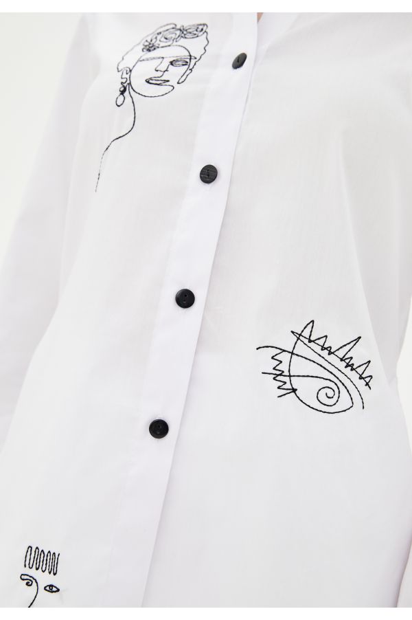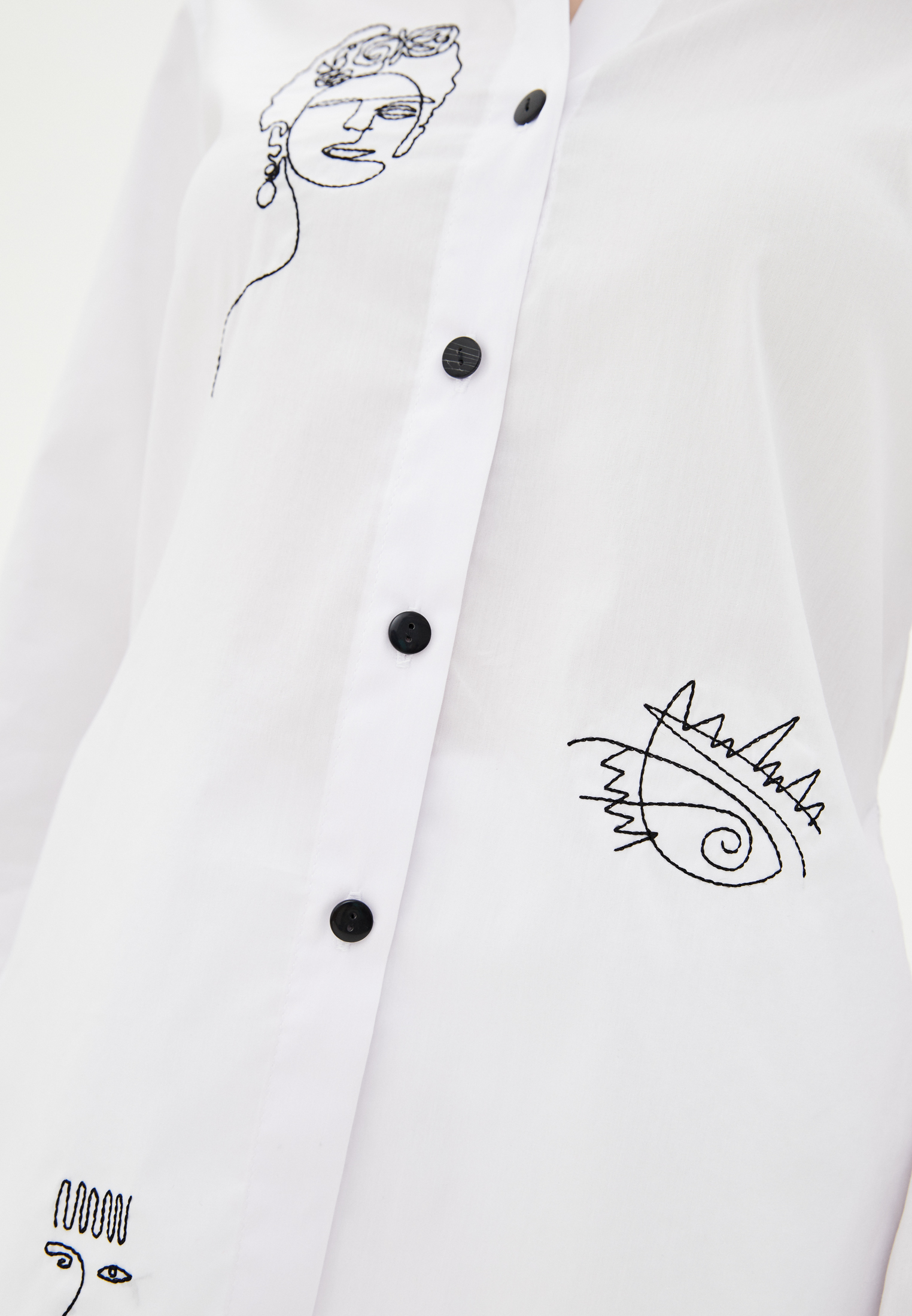 Стильная женская рубашка белого цвета. Украшена авторской вышивкой. Застегивается на декоративные пуговицы. Над манжетами рукавов защипы. В боковых швах разрезы.
