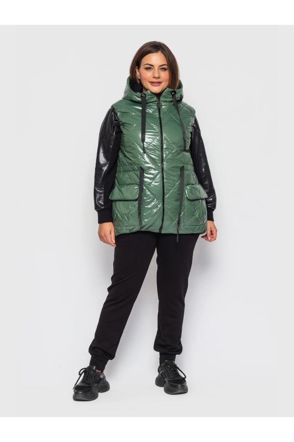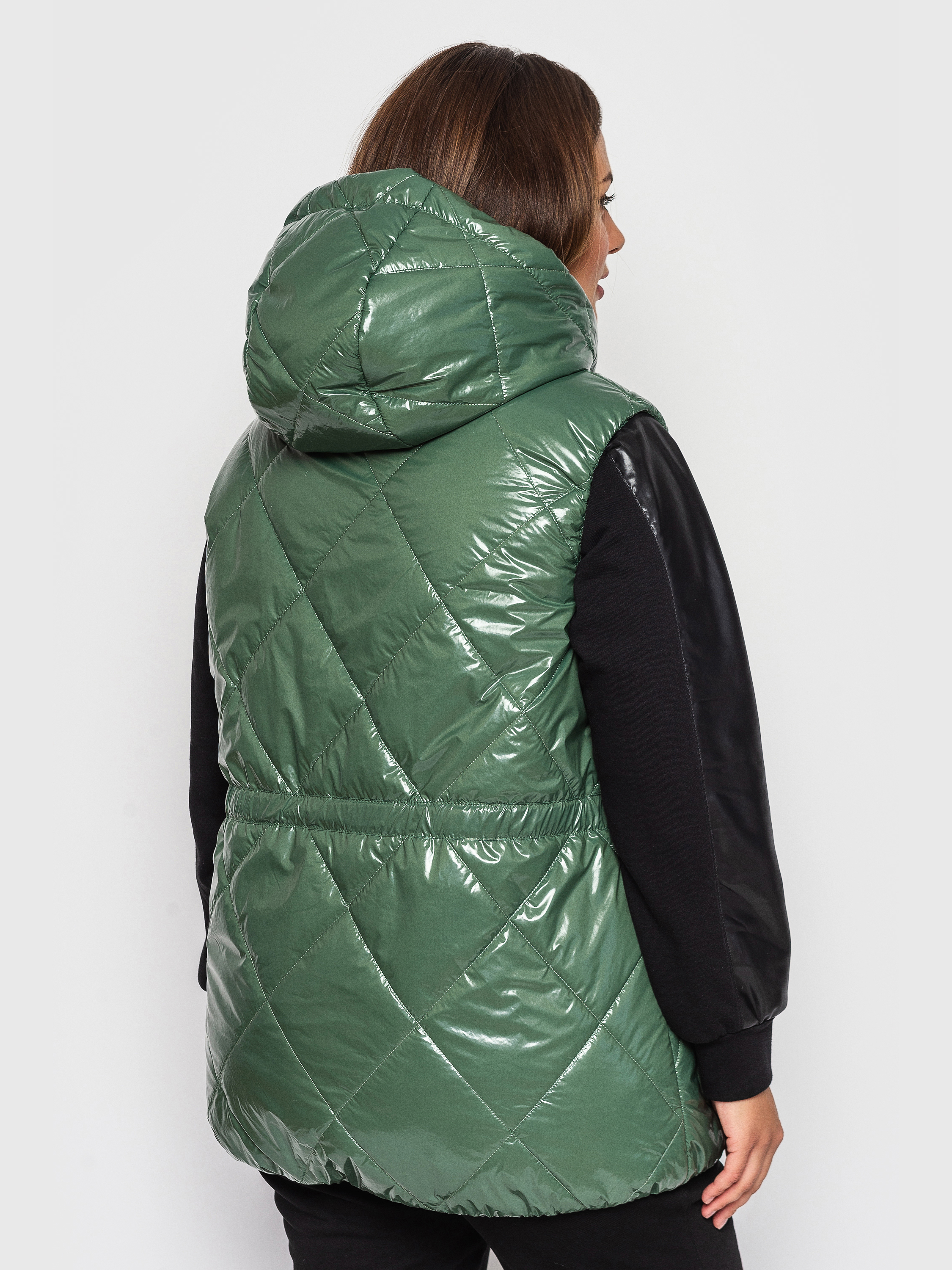 Стеганный стильный жилет с красивым глянцевым блеском. Утеплитель - синтепон плотностью 80 гр/м², подкладка в тон изделия. По талии проходит кулиса, что обеспечивает сохранение тепла. Край и пройма жилета собраны на резинку, гарантируя плотное прилегание изделия. Вместительные карманы оформлены клапанами-отворотами. Удобный капюшон регулируется завязками на люверсах.